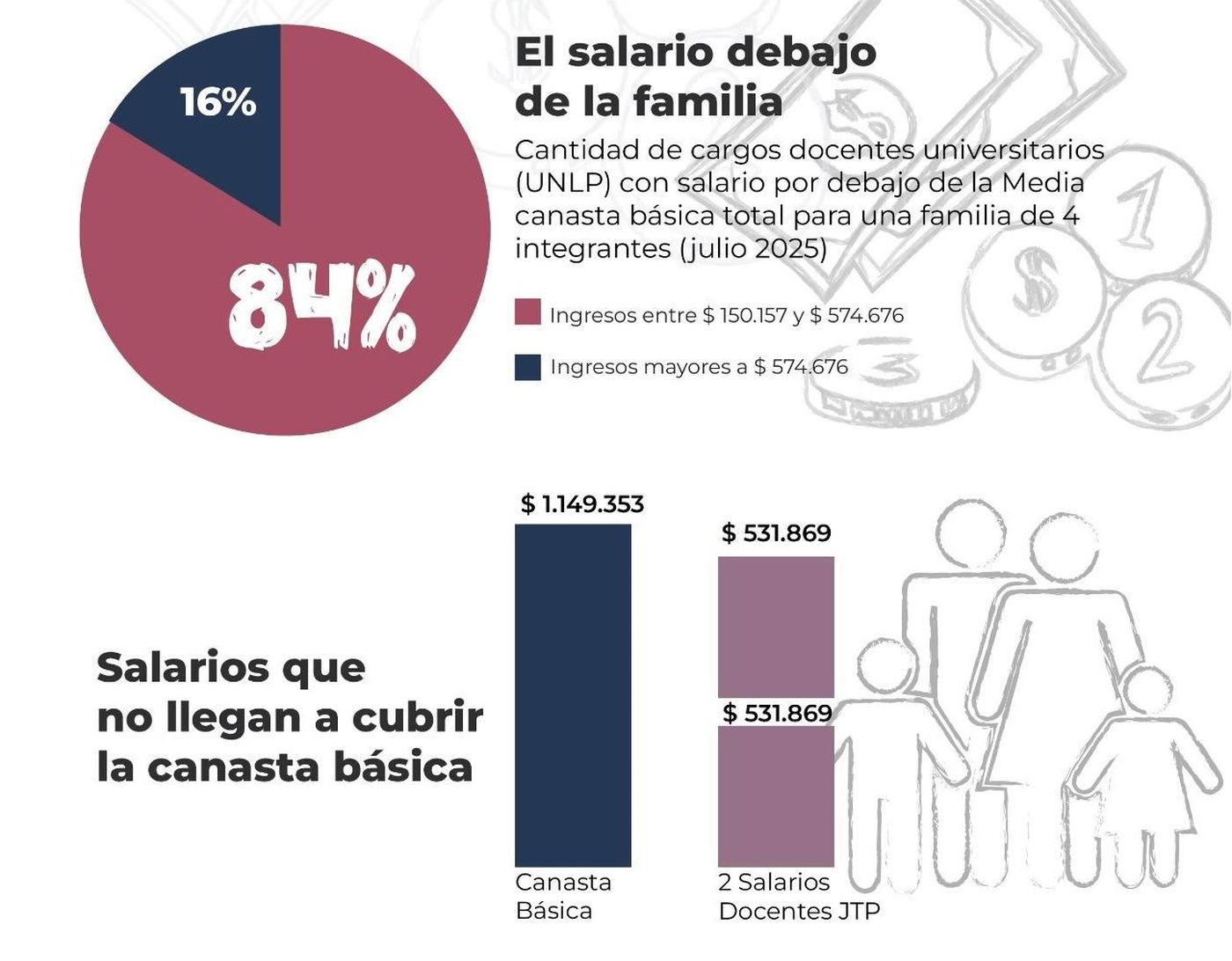 De acuerdo con los datos, casi el 84% de los docentes de la UNLP no alcanza a cubrir con su sueldo media Canasta Básica Total, estimada en $1.149.353 para una familia de cuatro integrantes. Dos salarios de jefe de trabajos prácticos con dedicación simple, que promedian $531.869 cada uno, no llegan a cubrir esa canasta. El informe también indicó que, para recomponer los salarios a niveles de noviembre de 2023, se necesitaría un aumento superior al 40%.