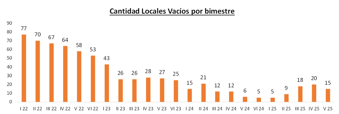 La comparación con períodos recientes ofreció un matiz distinto: entre julio y agosto se habían registrado 20 locales vacíos, por lo que el número actual representó una leve baja del 5%. Aun así, la secuencia reveló una curva ascendente desde marzo-abril, cuando se contaron nueve cierres, seguida por 18 en mayo-junio y luego 20 en julio-agosto, lo que confirmó la persistencia de dificultades en el movimiento comercial.